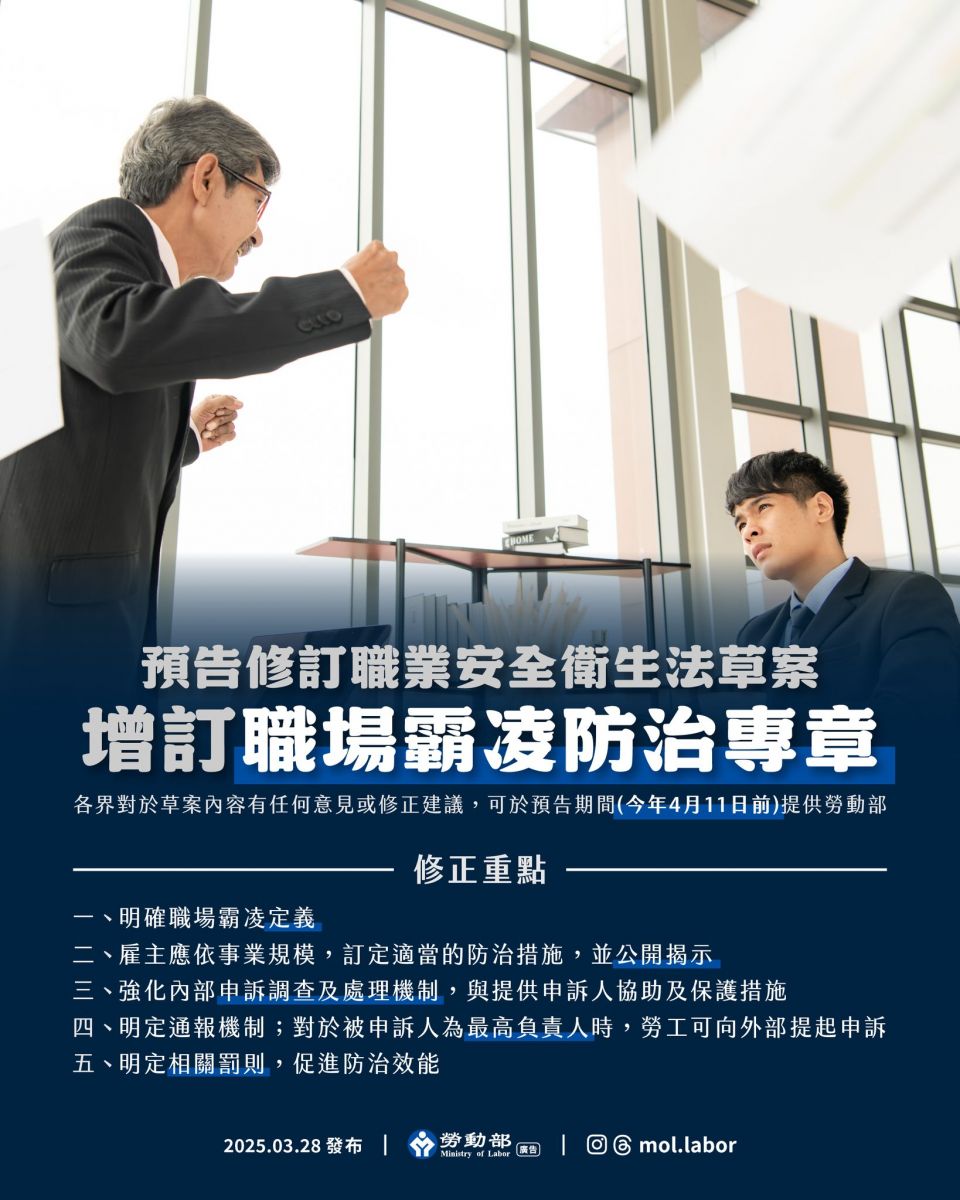 我國行政院早前於8 月 28 日通過勞動部修正部分條文的《職業安全衛生法》草案,交由立法院審議,增訂「職場霸凌防治專章」,當中包括:明確定義職場霸凌、要求雇主訂定防治措施、強化申訴、調查及處理機制,以及明定通報機制和罰則等等。
