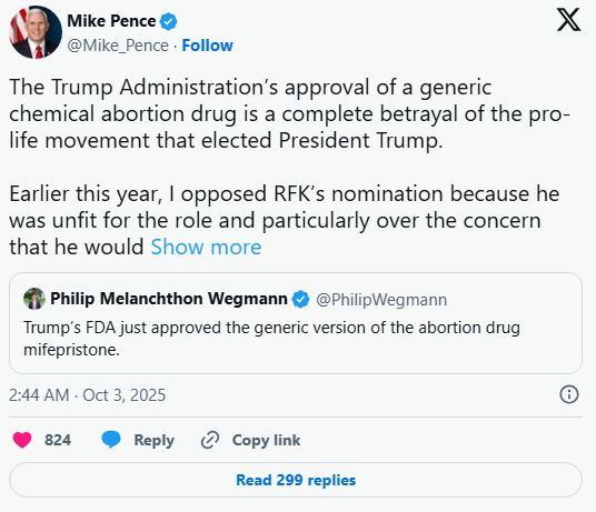 幾個禮拜前,衛生與公共服務部(Health and Human Services Department,HHS)部長小甘迺迪(Robert F. Kennedy Jr.)和 FDA 專員馬卡里(Martin Makary)承諾會重新審查米非司酮的安全性和有效性。前副總統彭斯(Mike Pence)批評川普政府「徹底背叛」了反墮胎承諾,要求小甘迺迪下台。