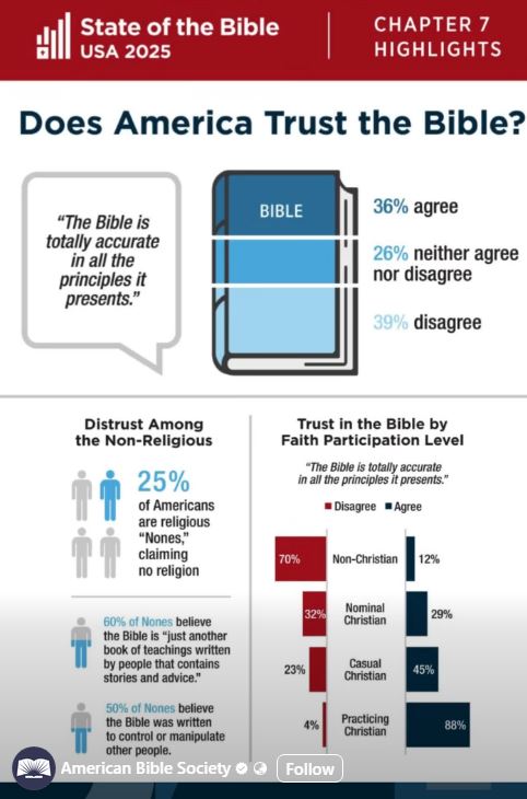 美國聖經協會 (American Bible Society)最近發布了《2025 年美國聖經狀況》(State of the Bible USA 2025)報告,原則上,大部份(88%)認真對待信仰的基督徒都同意《聖經》完全正確,但對於那些認為信仰不太重要或掛名的基督徒來說,有3至4成的人不同意《聖經》完全正確,而大多非基督徒(70%)也無法接受《聖經》完全正確。