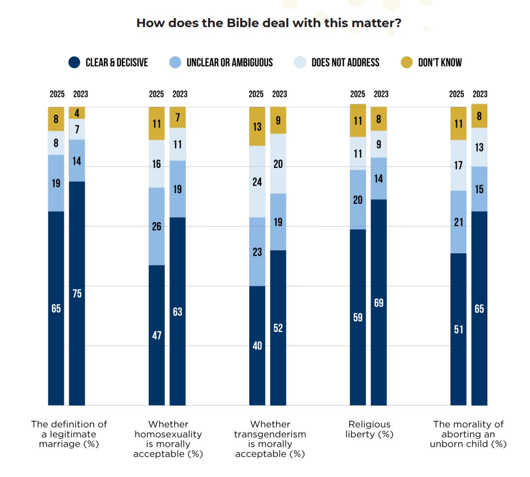 該研究顯示,對於同性戀是不是在道德上可以接受,只有 47% 恆常出席教會聚會的基督徒相信《聖經》「清晰明確」,與 2023 年相比下降了18%。