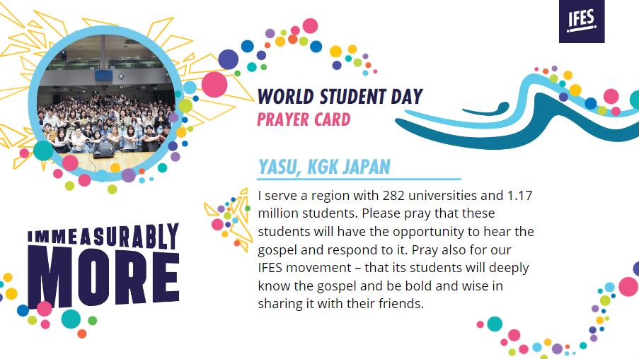 世界學生日的主題為「更無可衡量」(Immeasurably More),同心祈求神在全地的校園成就更豐盛的工作。IFES 助理秘書長Annette Arulrajah樂見IFES各地學生在禱告中互相扶持,同時有教會、其他領袖和弟兄姊妹與學生一起站立。