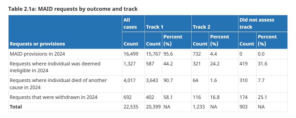 加拿大實施安樂死將近10年,安樂死人數刷下新紀錄,根據「加拿大衛生部」(Health Canada)《醫療協助死亡第六份年度報告》(Health Canada's Sixth Annual Report on Medical Assistance in Dying),2024 年共有 16,499 人安樂死,約佔全國總死亡人數5.1% ,而近年增幅最大則是2019年至2020年,高達36.8%