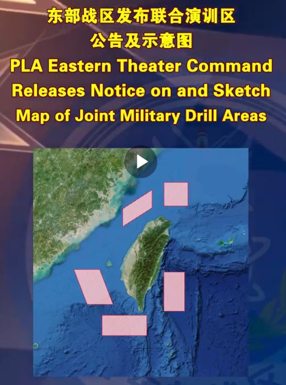 按座標及圖片顯示,軍演共有5區:基隆以北、台東以東、屏東以南、澎湖西南海域及桃園西北至馬祖的台灣海峽範圍。為安全起見,軍演期間有關船隻和飛行器不要進入上述海域和空域,東部戰區還先後在微博上發佈2項文宣:「正義之盾、破限除妄」及「正義之箭、內控外驅」。