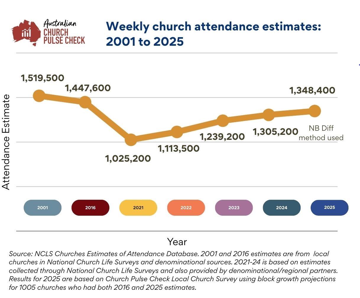 然而,與歷史數據相比,2025年的出席人數僅恢復至2001年的水平,即89%。這意味著雖然教會人數正在回復,卻仍然面臨重大的挑戰。NCLS調研不久將釋出完整報告,給澳洲眾教參考。