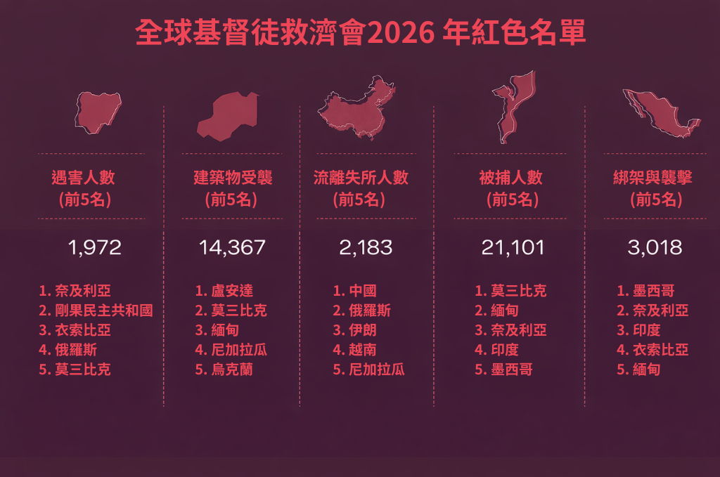 與此同時,「全球基督徒救濟會」(Global Christian Relief, GCR)也發布了「2026 年紅色名單」(Red List),從2023 年至 2025 年的數據歸納出5種類別,列明奈及利亞、盧安達、中國、莫三比克和墨西哥這些類別中最危險的國家。