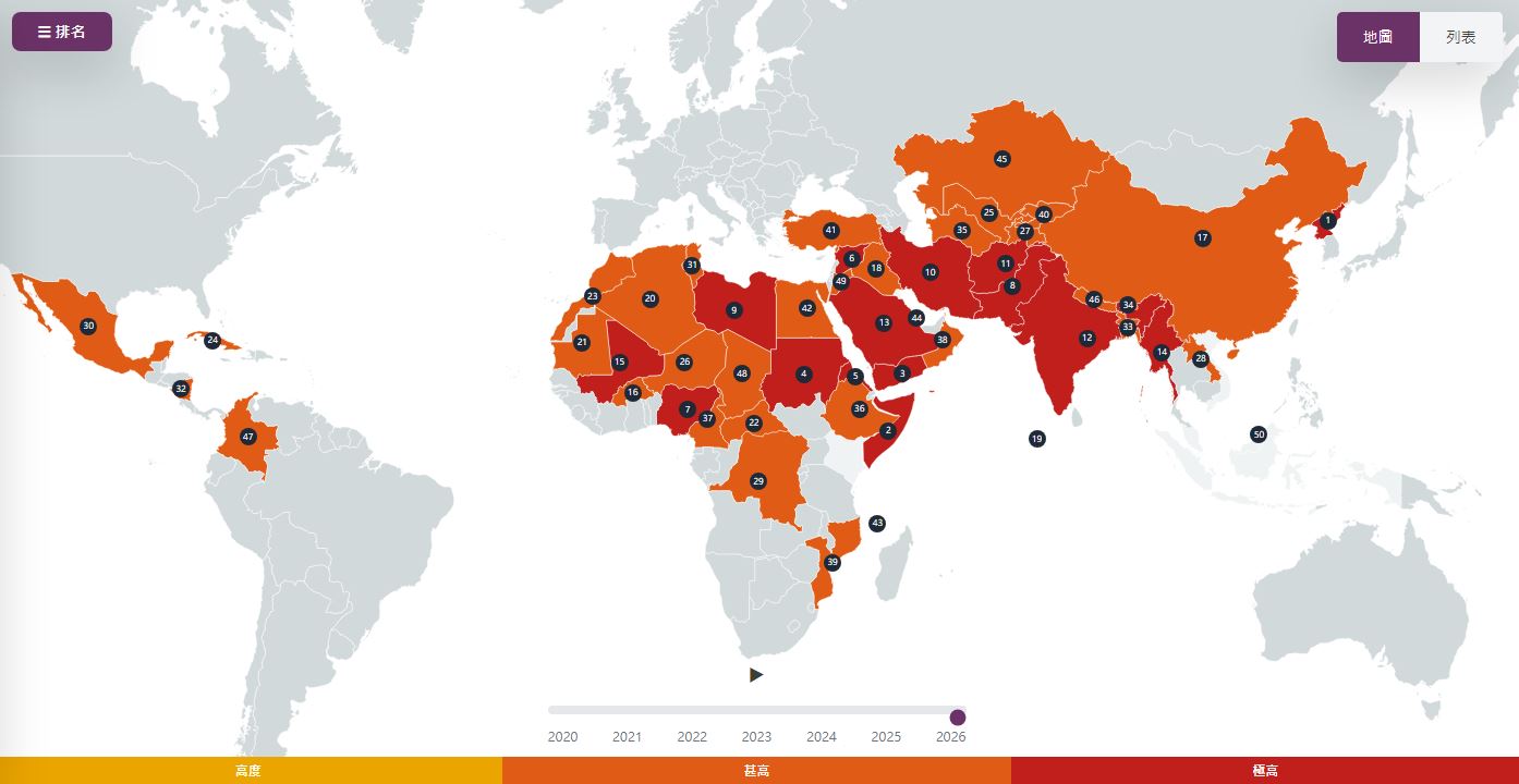 敘利亞(Syria)從去年的第 18 位躍升至第 6 位。自阿薩德(Assad)政權於 2024年倒台後,沙姆解放組織(Hay'at Tahrir al-Sham)主導政權過渡,確立伊斯蘭教法(Sharia)為立法依據。雖然某些地區比阿薩德時期自由,但全國政局仍然不穩。