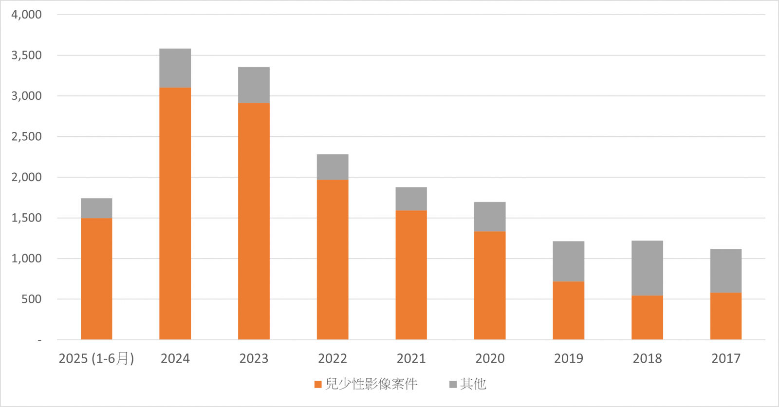 兒少性影像案件(2017至2025上半年)。資料來源:衛福部保護司國度復興合一禱告聯盟(原《國度復興報》)Facebook粉絲專頁