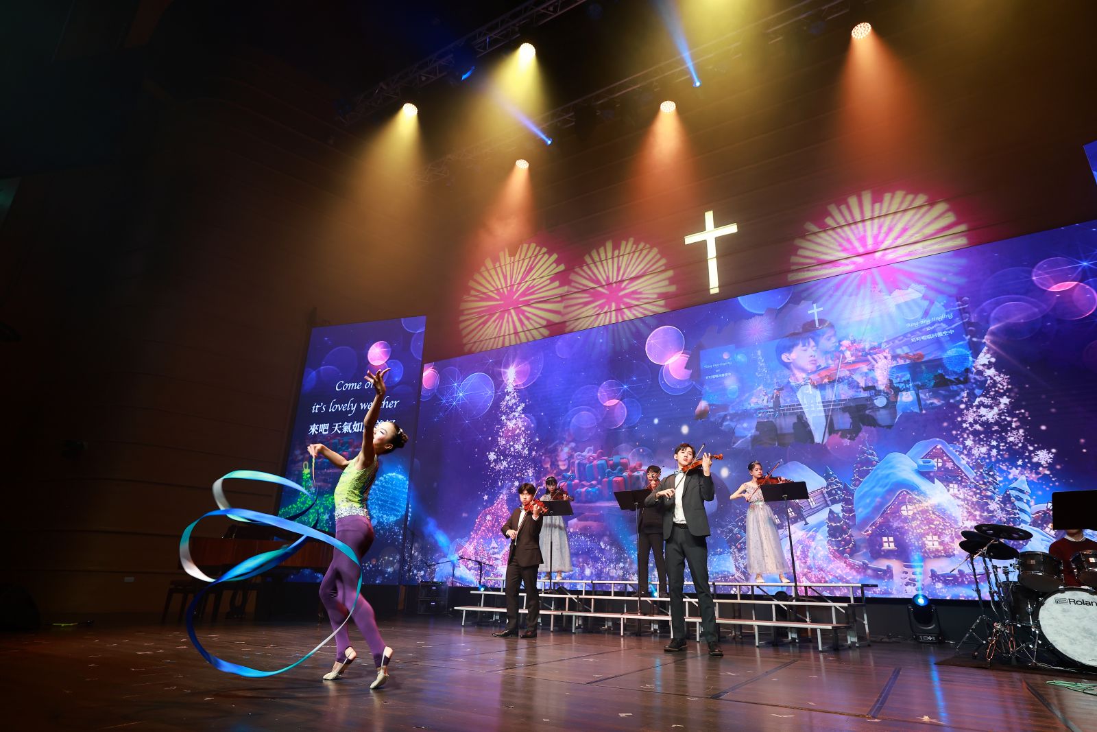 以小提琴合奏結合快閃舞蹈揭開音樂會序幕,帶領觀眾走進聖誕的喜樂氛圍。圖:夏凱納靈糧堂弦樂、舞蹈與合唱與交織,共譜平安夜的星光樂章