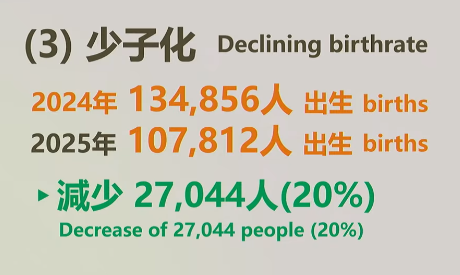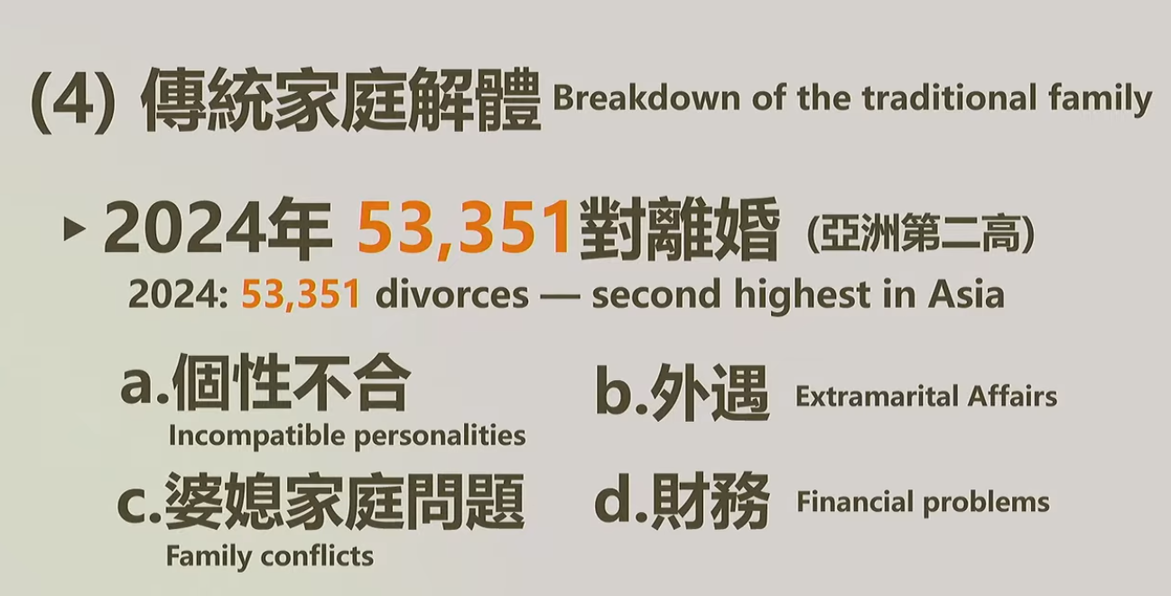 三、少子化:台灣出生率為全球第三低,平均每對夫妻生 1.2 個小孩。出生人數從 2024 的 13 萬,下降至 2025 年 de 10 萬。而年輕一代因生活成本高和價值觀改變,趨向不婚或晚婚,加上社會結構改變,少子化導致主日學與青少年事工萎縮。