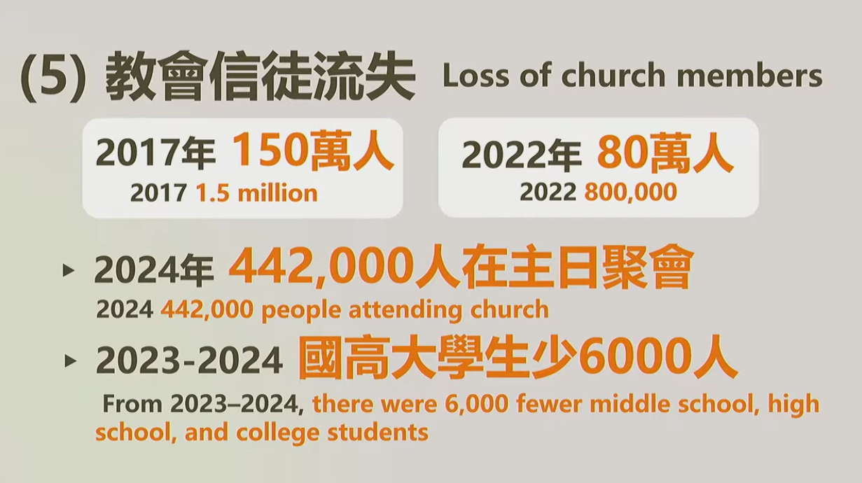 五、基督徒嚴重流失:台灣基督徒人數從 2017 年的 150 萬人,銳減至 2024 年的 44 萬人。學生是最嚴重流失的群體,在 2023 至 2024 年,國高大學生少了 6,000 人,甚至北部部份教會完全缺失了這個群體。