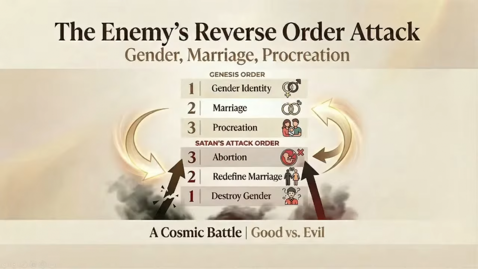 仇敵的攻擊是按著從創世記到啟示錄,攻擊神的形像及天國的景象,並且反向操作:神賜給人性別身分、婚姻和生育,仇敵就藉由墮胎、重新定義婚姻及摧毁性別攻擊。美國政府於 2022 年通過《尊重婚姻法案》,取締 1996 年《婚姻保護法》,不再將婚姻定義為「一男一女」。