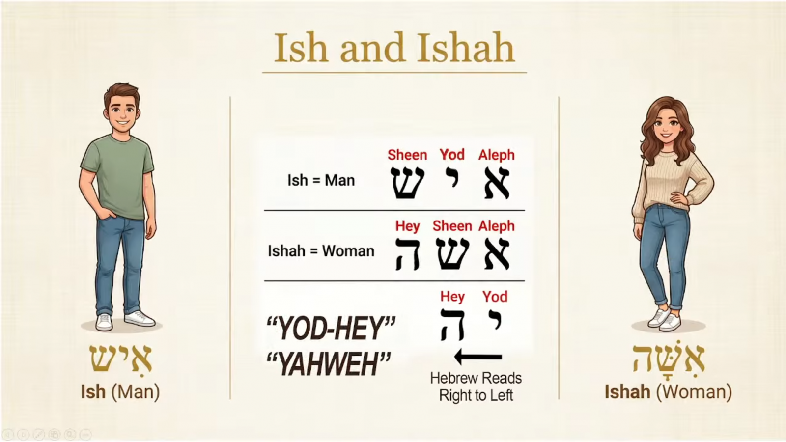 在創世記,神創造「一個人」(adam),然後說:「那人獨居不好。」因為他無法進入關係。神取下他的一條「肋骨」(צֵלָע)——原文為「一半」或「一邊」,造成女人。根據希伯來文,男人和女人只差一個字母,將兩者合併變為「Yod-Hey」(或「YAHWEH」耶和華)。
