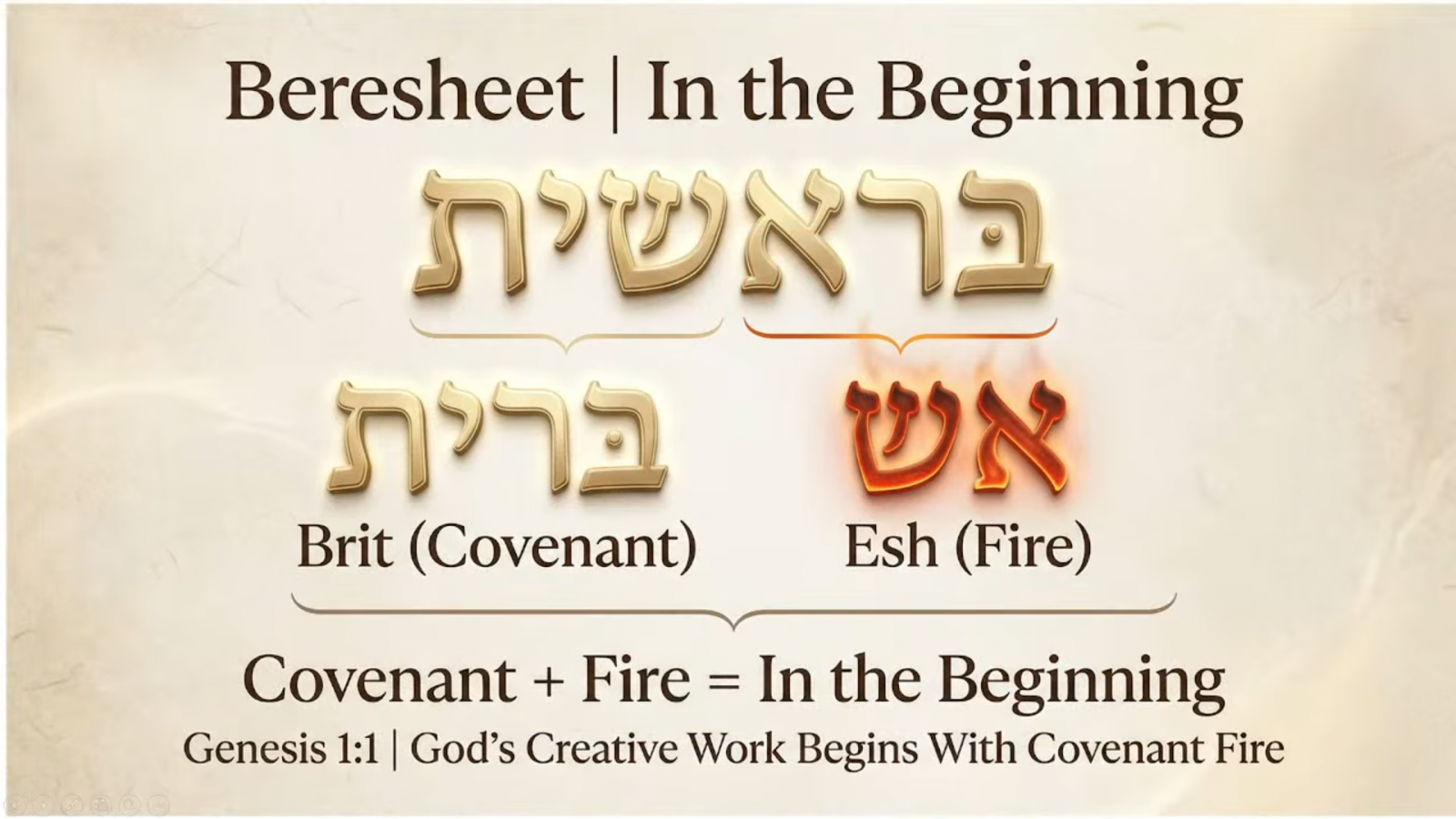 「創世記」(בְּרֵאשִׁית)的字母取自「盟約」(בְּרִית)和「火」(אֵשׁ)。有一位猶太拉比曾說:「婚姻如此神聖,甚至成為聖經第一個字,男女之間的情愛是為了將神所分開的亞當,再次藉由盟約結合,其本質是聖潔和公義。」創世記是聖經第一卷書,以火的盟約營造美好的婚姻,但撒但意圖透過離婚、同性戀、變性、虐待、色情、淫亂等方式破壞婚姻,破壞神在地上的形像。