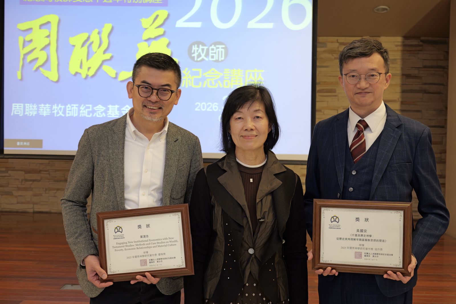 周聯華牧師一生致力於牧會、神學教育與華人教會交流,設立神學研究著作獎與神學博碩士學位論文獎,正是延續他重視信仰反思與神學思考的精神,鼓勵更多學者與信徒投入神學研究。本次年度神學研究獎項:「優秀神學研究著作獎」優等獎由葉漢浩博士獲得,其著作從新制度經濟學(NIE)為理論基礎,重新審視財富、貧窮、物質文化等主題,展現跨學科研究的可能,不僅拓展新約研究的經濟視角,也為學者提供一套可實際運用的方法論資源。
